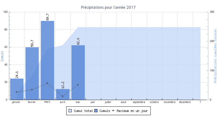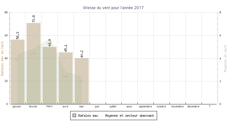 | fevrier | -2.1 °C | 2.3 °C | 15.4 °C | 8.4 °C | 5.1 °C | 4.8 km/h | 70.8 km/h | 226 |