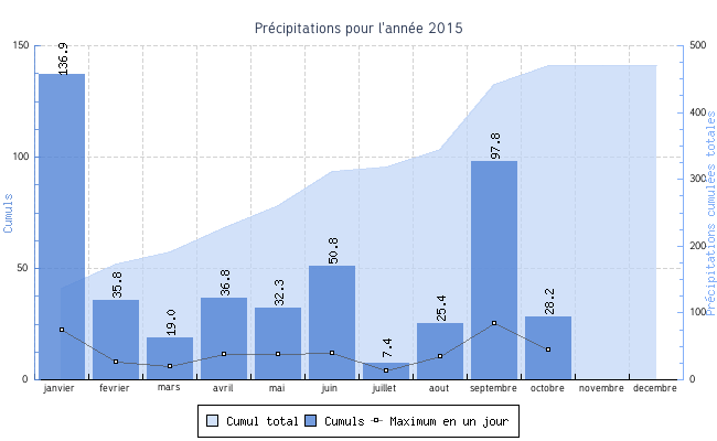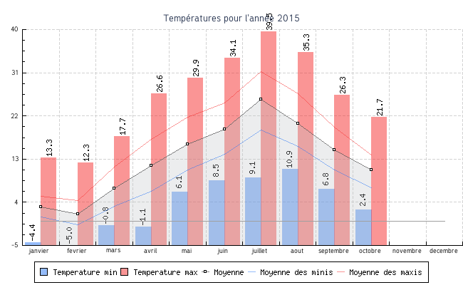 | octobre | 2.4 °C | 7.0 °C | 21.7 °C | 13.9 °C | 10.7 °C | 2.1 km/h | 30.6 km/h | ESE |