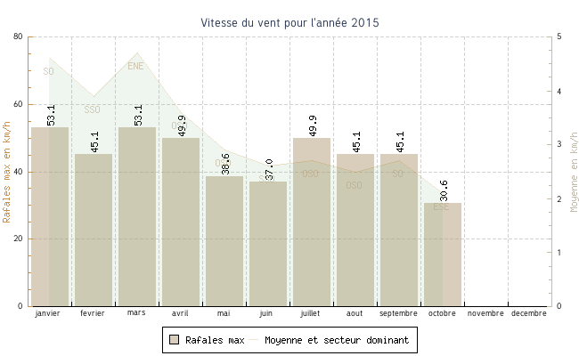 | janvier | -4.4 °C | 0.9 °C | 13.3 °C | 5.2 °C | 3.0 °C | 4.6 km/h | 53.1 km/h | SO |